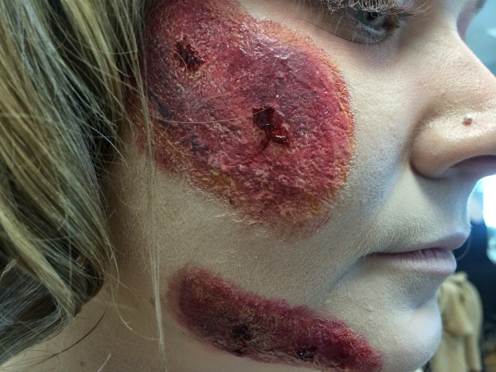 - I started with the base of the skin which firstly I wanted the burn on the clean skin first and then to add the rest of the products on top. I applied around 4 layers of latex on the skin and used a hair dryer in between layers to dry it quicker. I then picked at the latex to lift some off the face where there would be a whole so I could fill this are with blood.